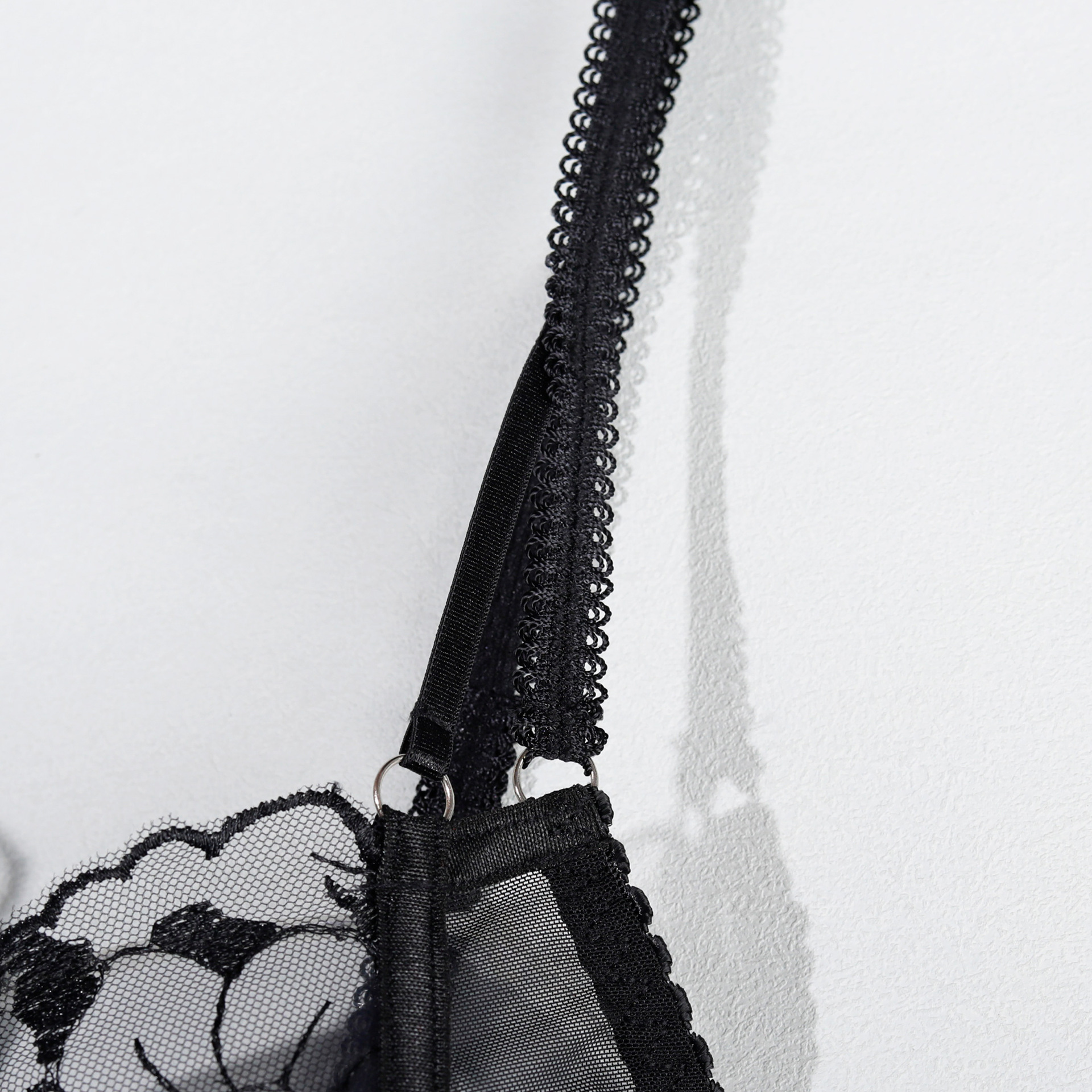 Sexy See-through Embroidered Flower Backless Cross Three-piece Underwear